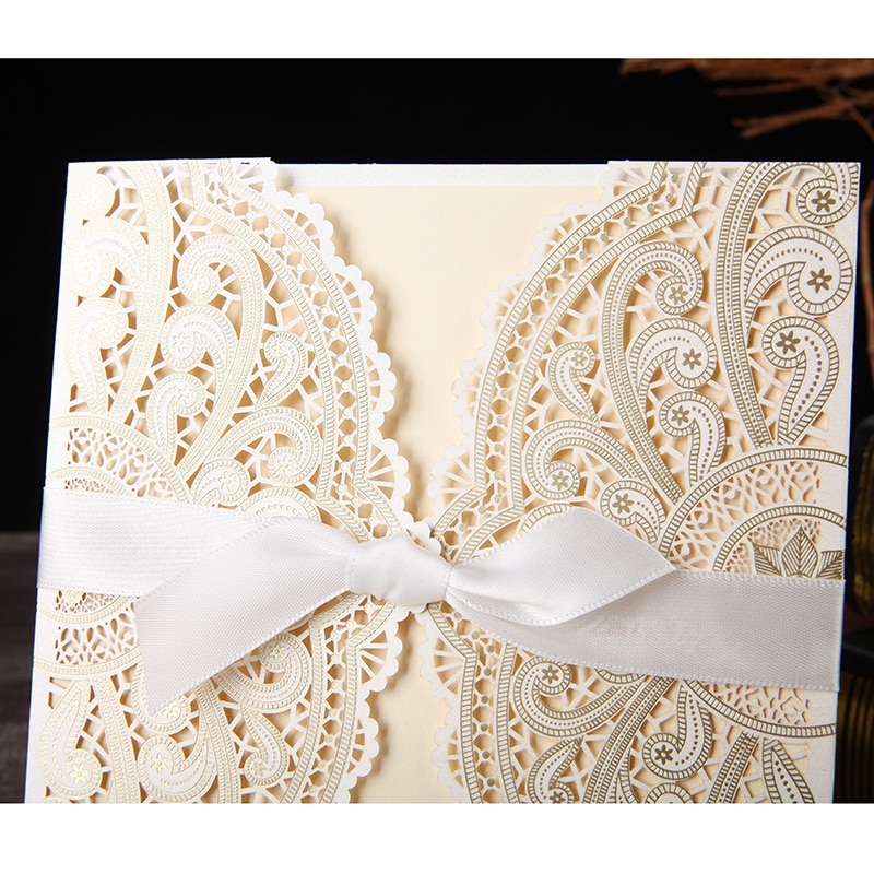 10Db / Tétel Elefántcsont Lézervágás Elegáns Esküvői Meghívók Kártya Csipke Üdvözlőkártya Egyéni Szalaggal Születésnapi