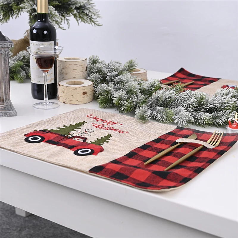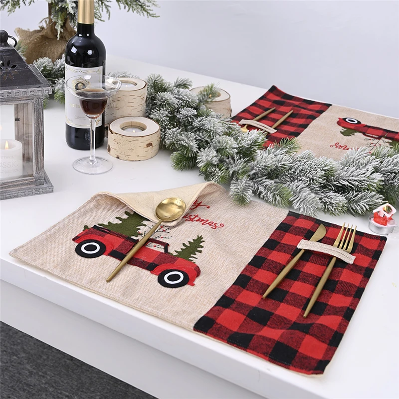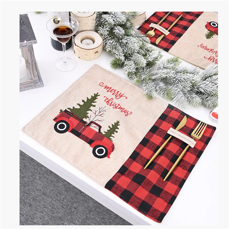 12 Pcs Karácsonyfa Piros Teherautó -Helyek Asztali Szőnyeg Téli Bivalyplaid Plaszat Étkező Otthoni Karácsonyi Dekoráció Nagykereskedelmi X2
