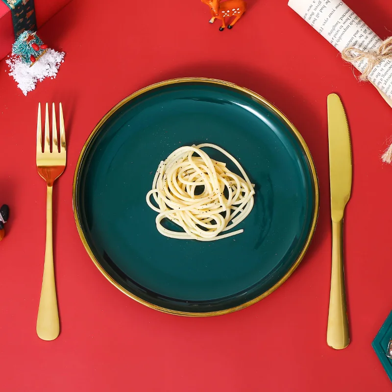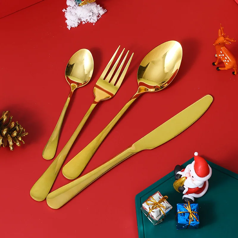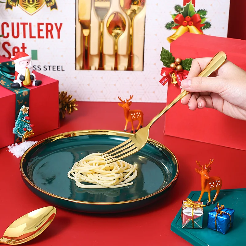 24Dics Arany Vacsorarakészlet Karácsonyi Edények Ajándékdoboz Rozsdamentes Acél Asztali Készletkészlet Villa Kanállal Mosogatógép Lapos Edénykészlet