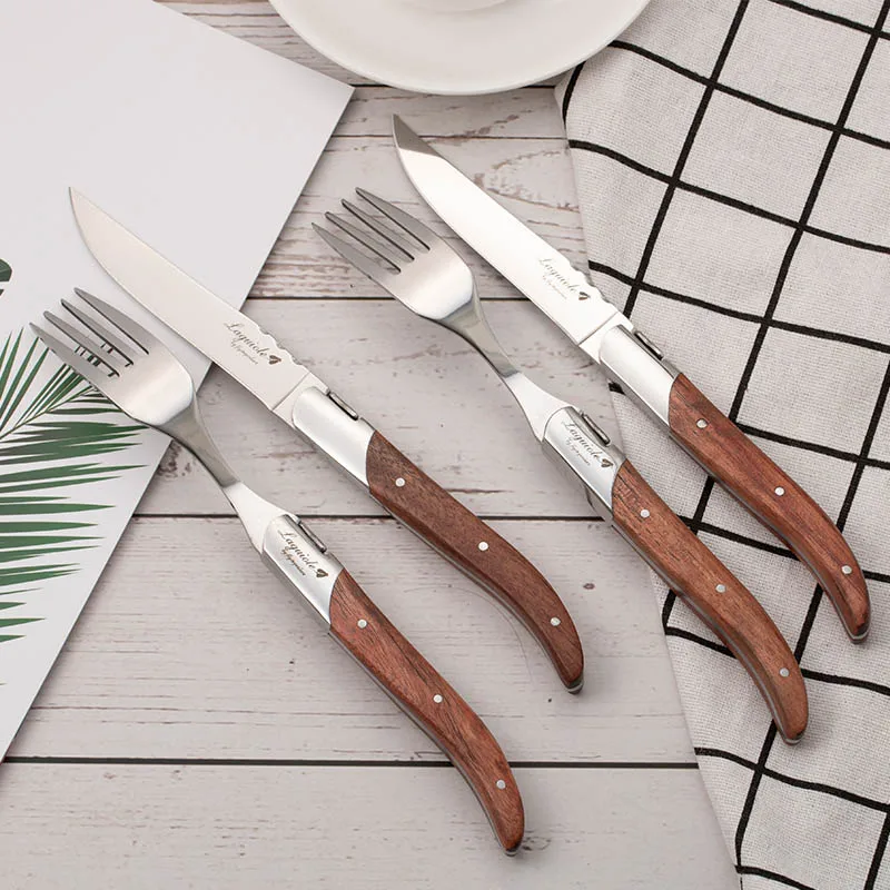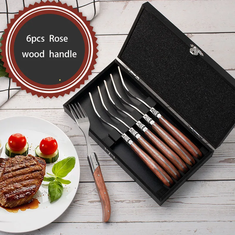 6Db Laguiole Steak Kések Villák Rózsa Fa Fogantyú Asztali Edények Xmas Étterem Rozsdamentes Acél Vacsora Késkészlet