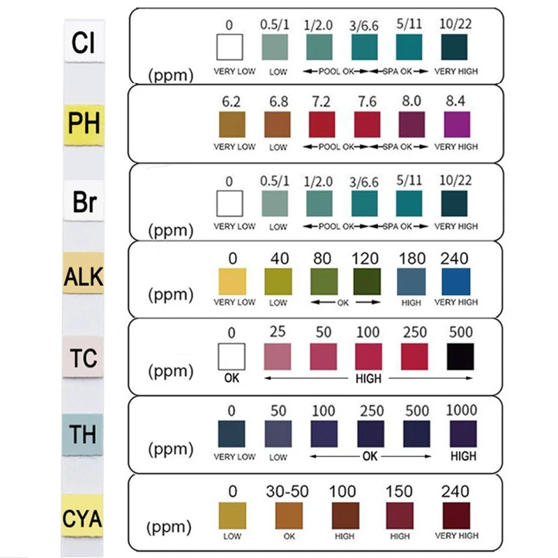 7 In-In-In-Víz Tesztcsíkok Úszómedence Akvárium A Klór-Bróm Lúgossághoz Ph Keménység Sav Vegyi Detektáló Kellékek