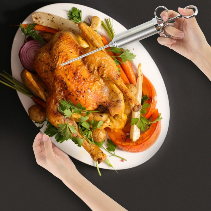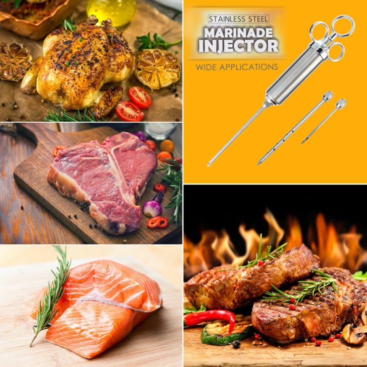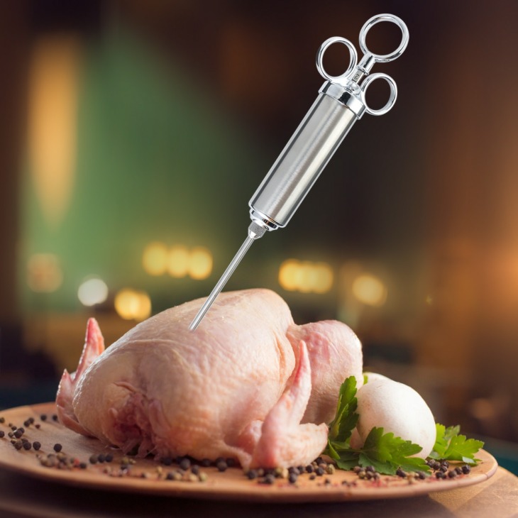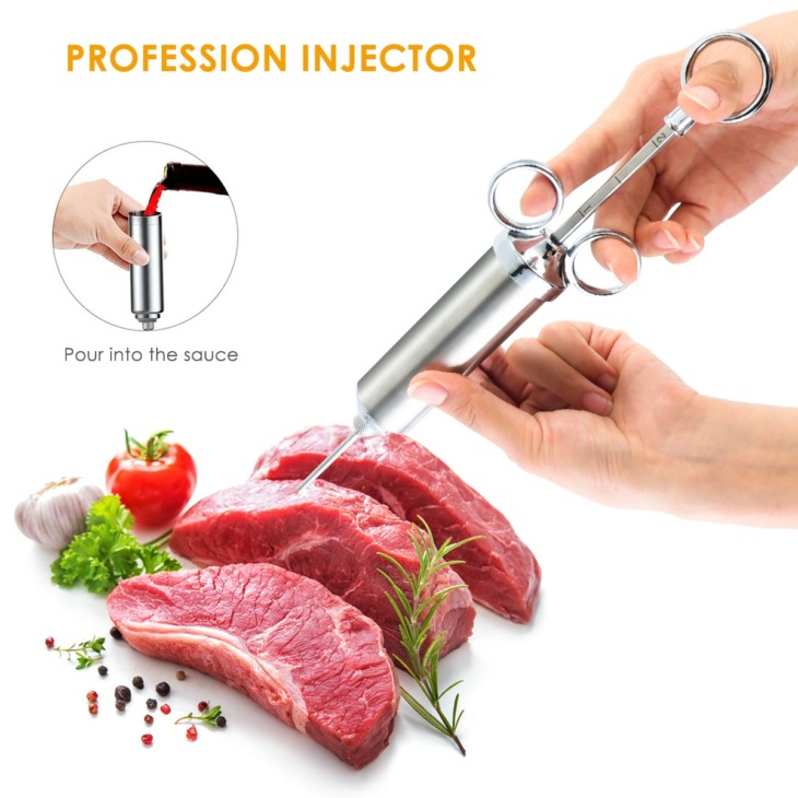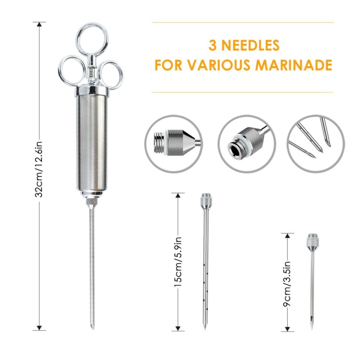 Élelmiszer -Fokozat 304 Rozsdamentes Acél Húsfecskendező Készlet 60 Ml -Es Nagy Kapacitású Hordóval 3 Pácos Tű Tisztító Kefe