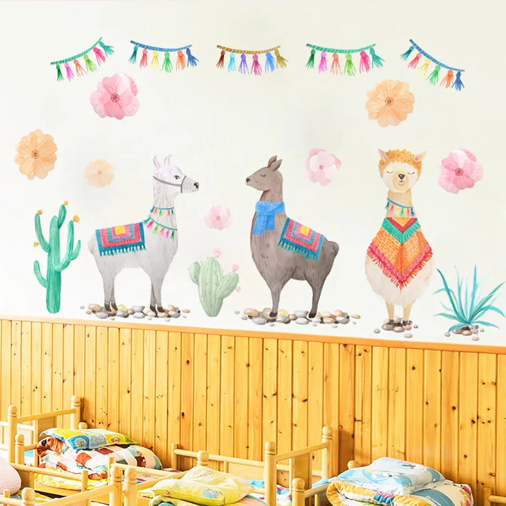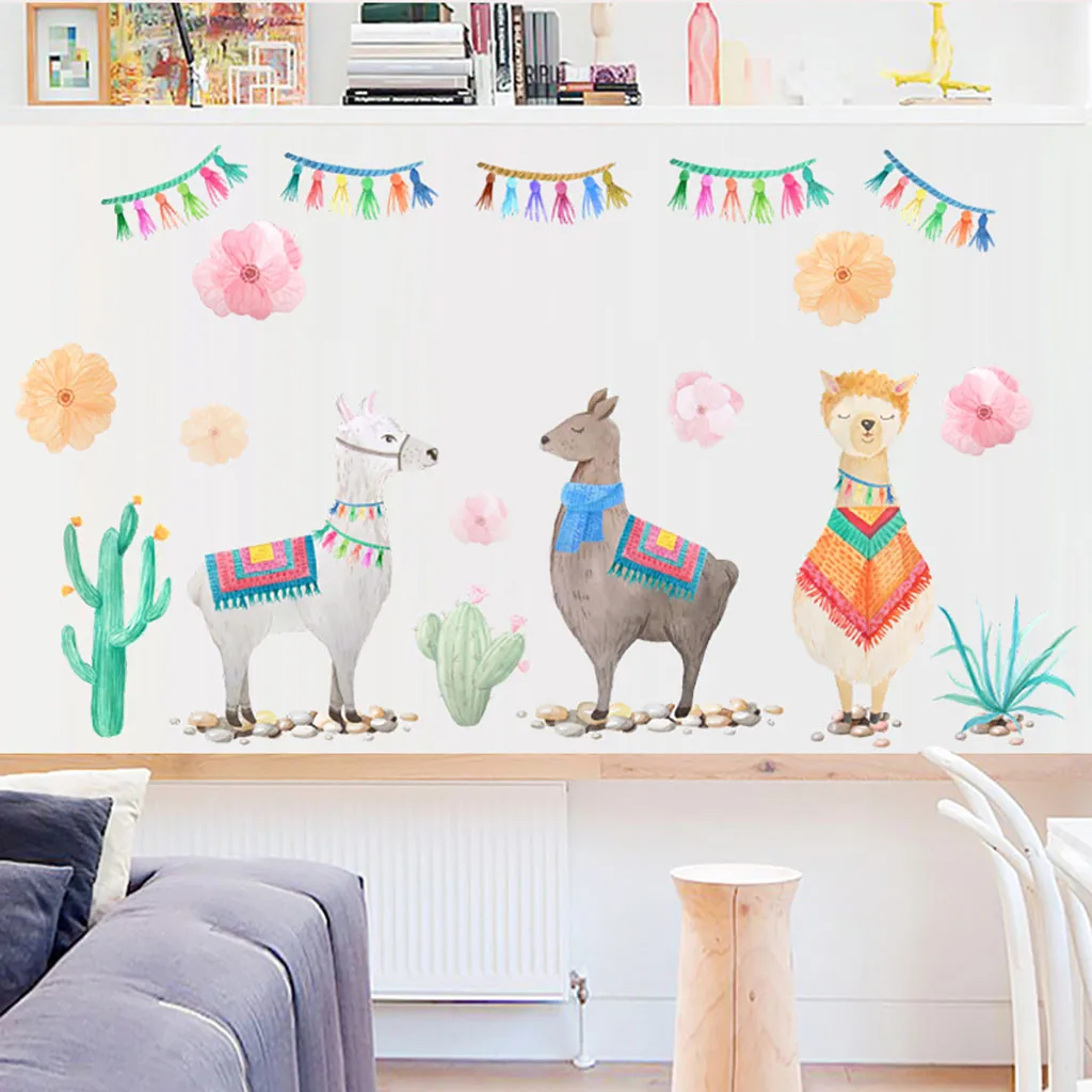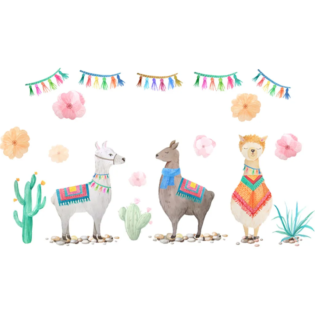 Forró Rajzfilm Állatok Alpaka Láma Fali Matricák Gyönyörű Kaktusz Növényi A Nappali Zenei Születésnapi Party Téma Ajándék