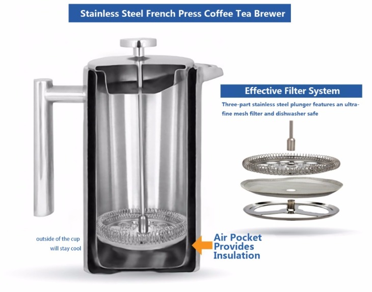 Francia Sajtó Kávéfőző Tökéletes Reggeli Kávéhoz (34 Oz), Hőálló, Hordozható Kávéfőzőhöz