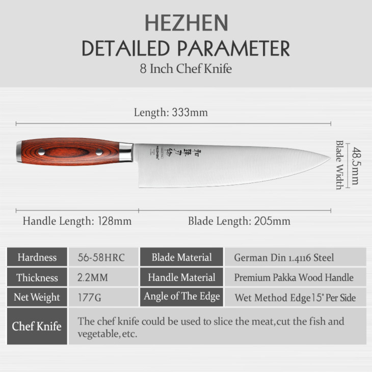 Hezhen 8 Hüvelykes Séf Kés Japán Konyha Szerszám Rozsdamentes Acél Német Din1.4116 Acél Gyönyörű Ajándékdoboz Pakka Fa Fogantyú