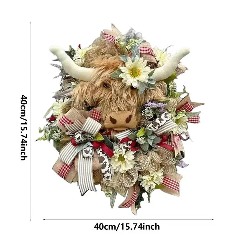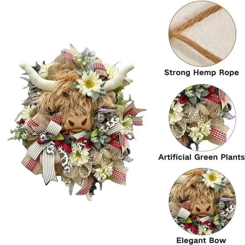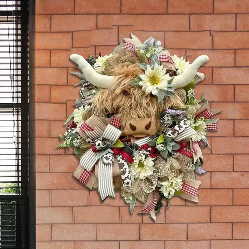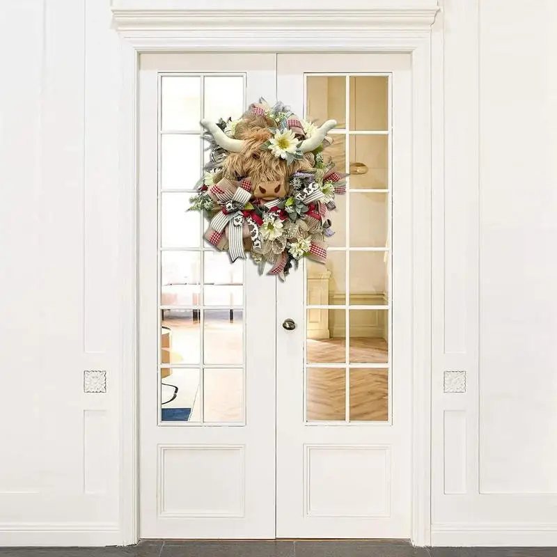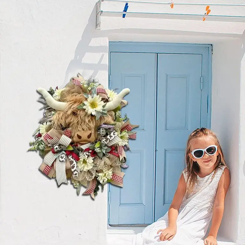 Highland Tehén Koszorú Fa Íjak A Fej Ajtó Virág Koszorúk Tavaszi Elülső Tornác Dekoráció Minden Évszakhoz Kültéri