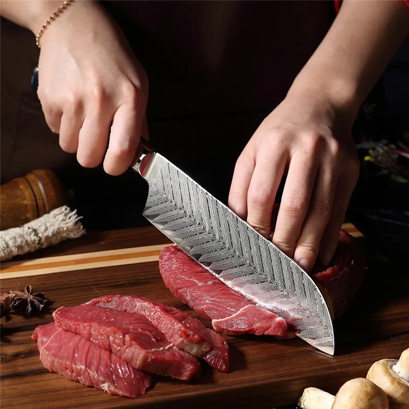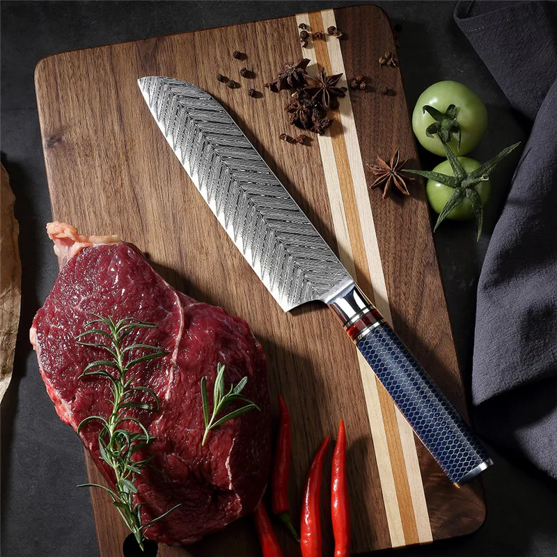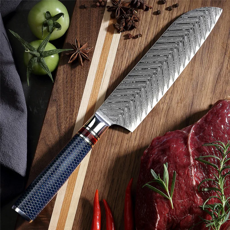 Japán Damaszkusz Santoku Kések 67Layer Sharp Blade Fországozott Hét Végrehajtó Kát Ktichen Evőeszközök Kés Dobozokkal