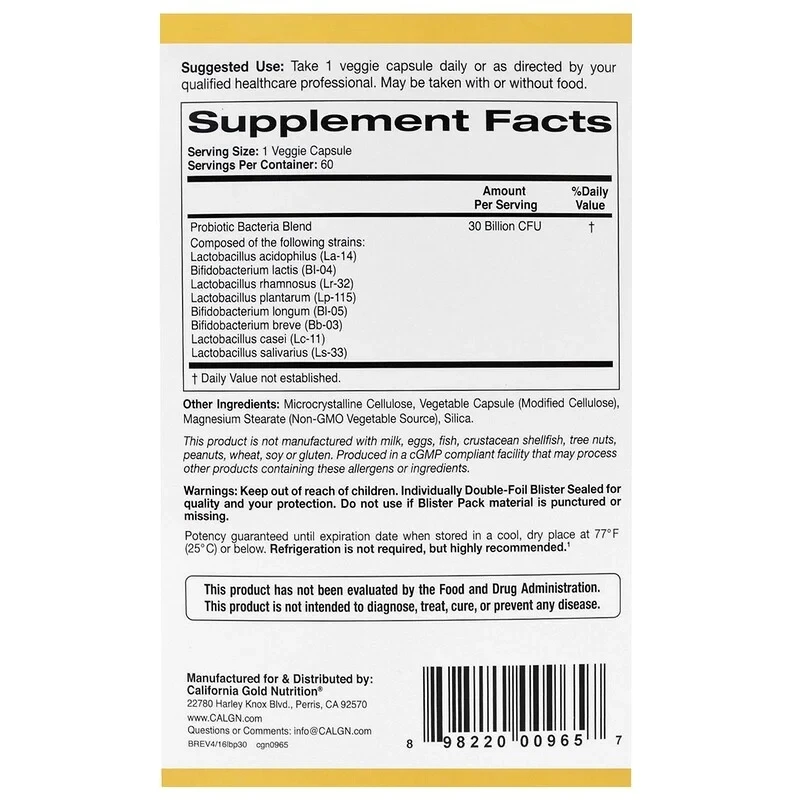 Kaliforniai Arany Táplálkozás, Lactobif Probiotikumok, 30 Milliárd Cfu, 60 Zöldségkapszula