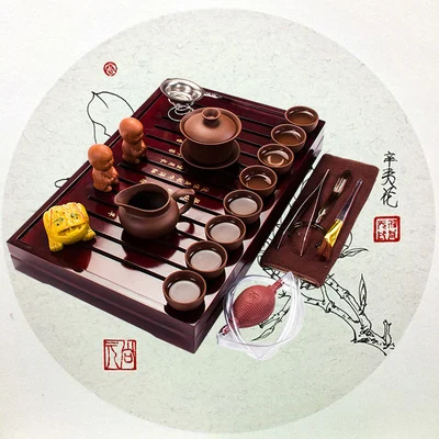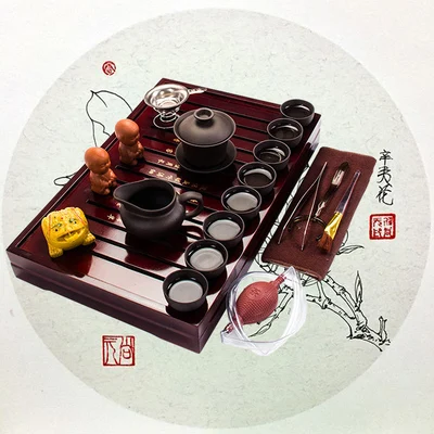 Kerámia Lila Agyag Tea Szett Kung Fu Pot Infúziós Szilárd Fa Tea Tálca Teáskanna Teáscsészék