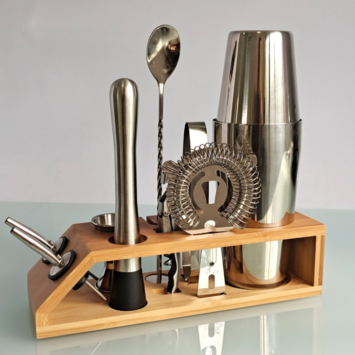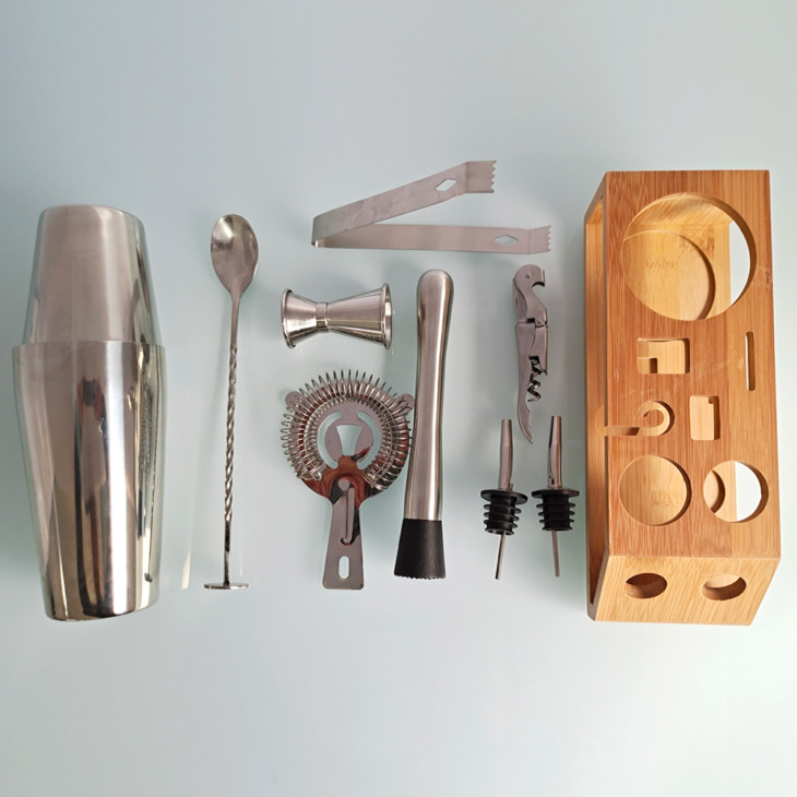 Koktél Shaker 10 Darabos Készletek Rozsdamentes Acél Trapéz Alakú Bambuszkeret Boston Shaker Csaposkészlet Martini Margarita Mixhez