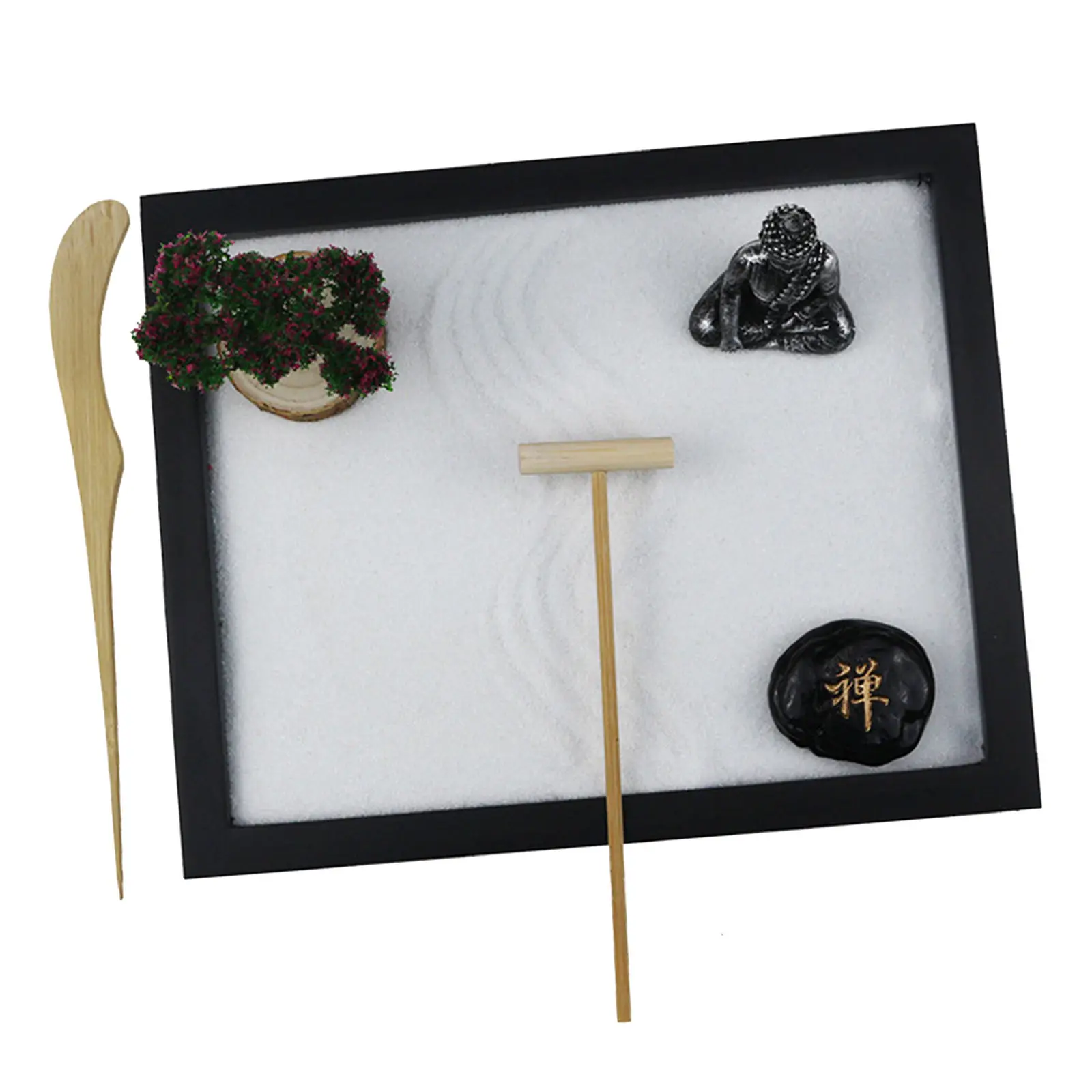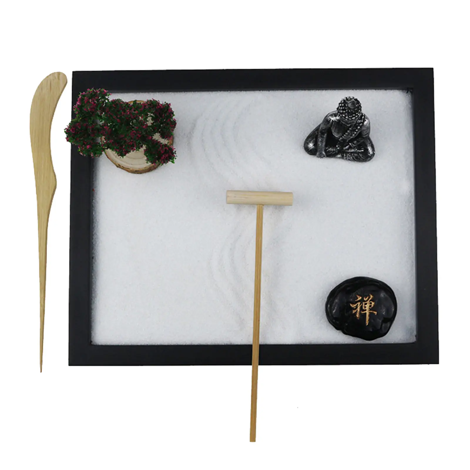 Mini Zen Garden Sand Table Ünnepi Figurák Rake Rocks Tree Buddha Szoborok Ajándékok A Stressz -Segélyek Otthoni Irodájához