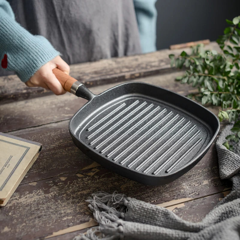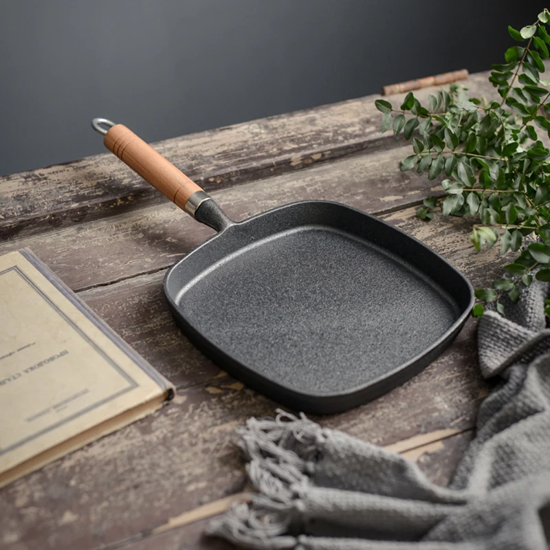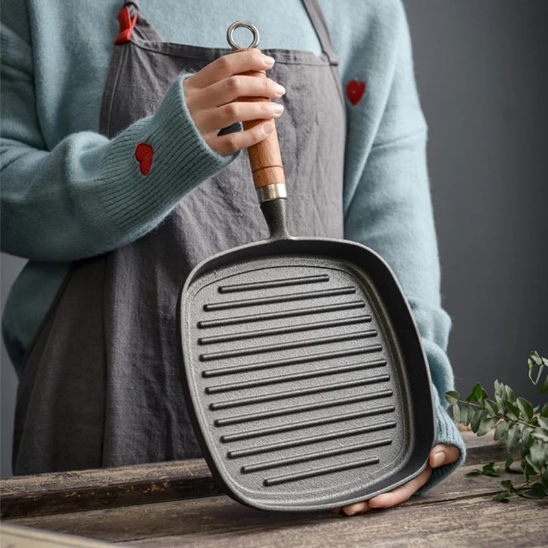 Nem Tapadó Steak Serpenyőben Öntöttvas Vasfaj Fogantyú Négyzet Alakú Grill Tányér Többfunkciós Csík Vastag Fenekű Serpenyők Főző Szerszámok