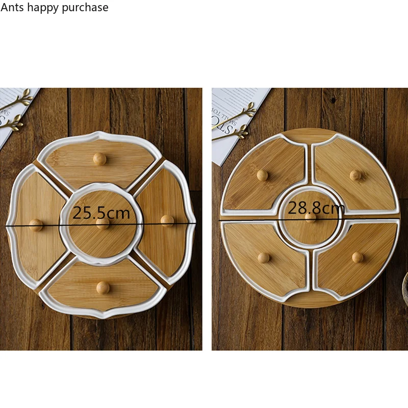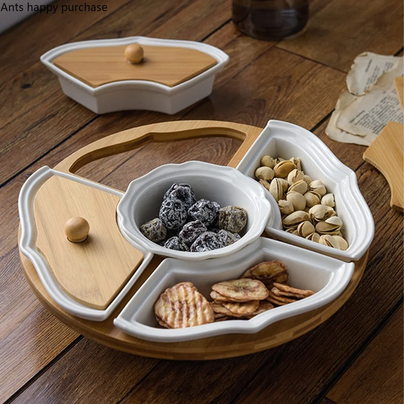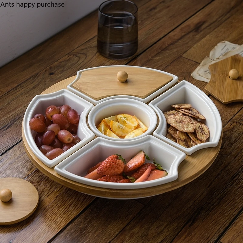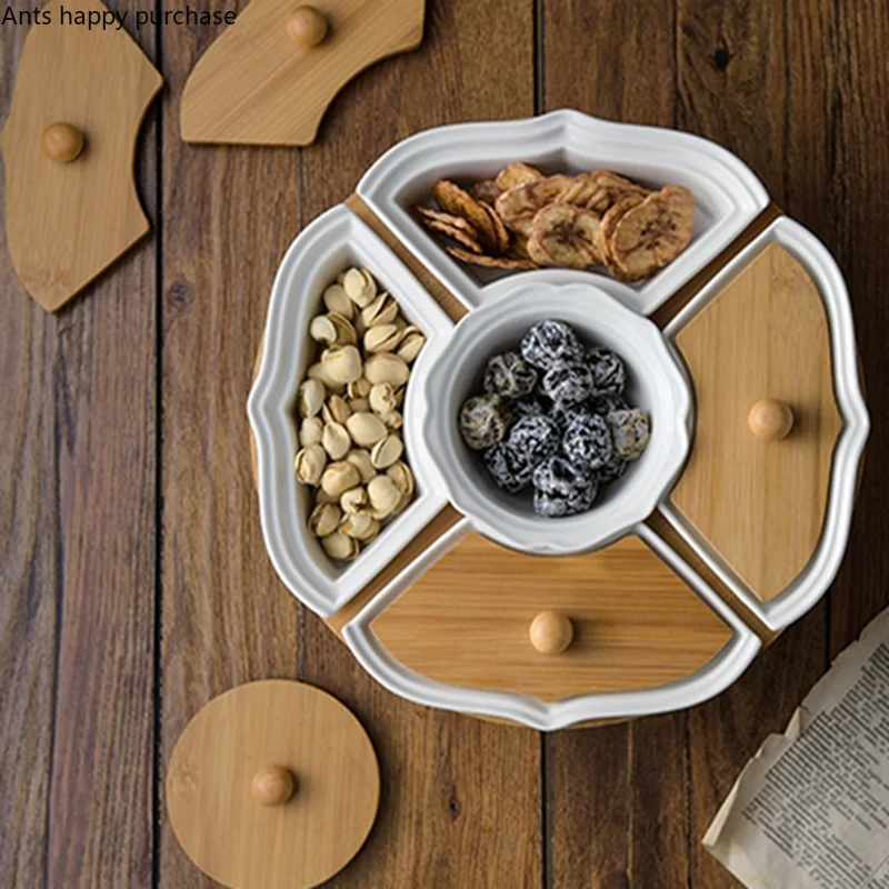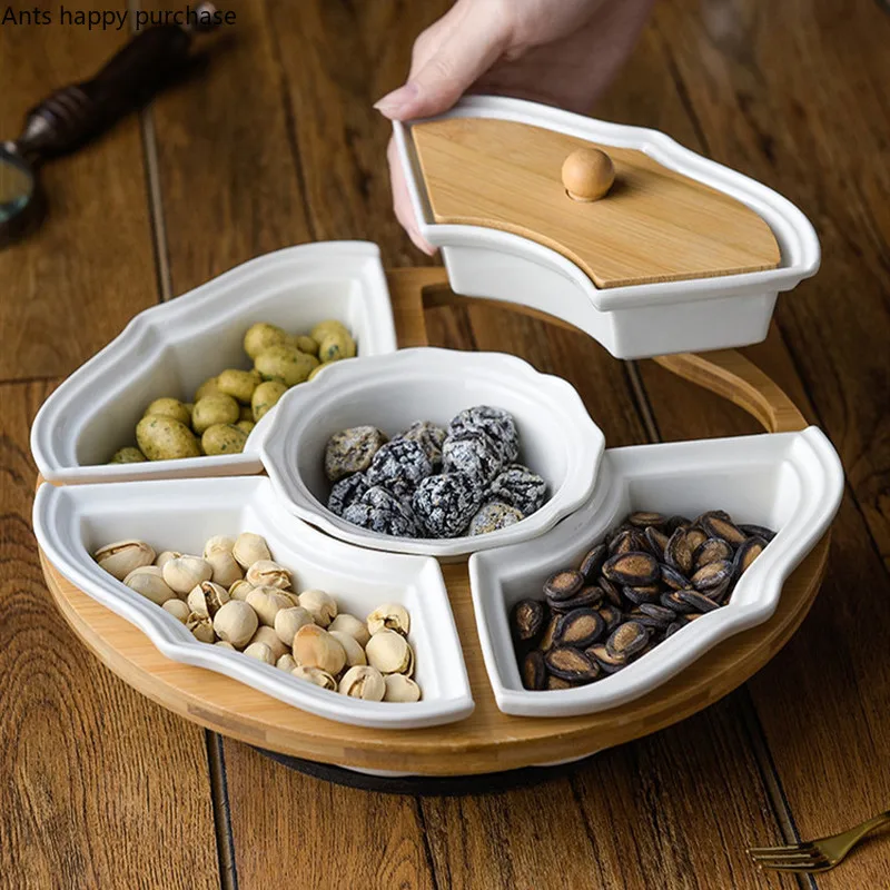 Öt Rács Forgó Tál Otthoni Kerámia Szárított Gyümölcslemez Fa Fedél Forgatható Tálca Por És Nedvességálló Snack