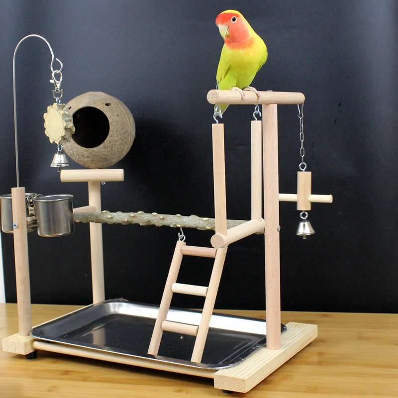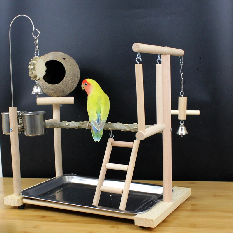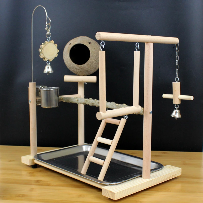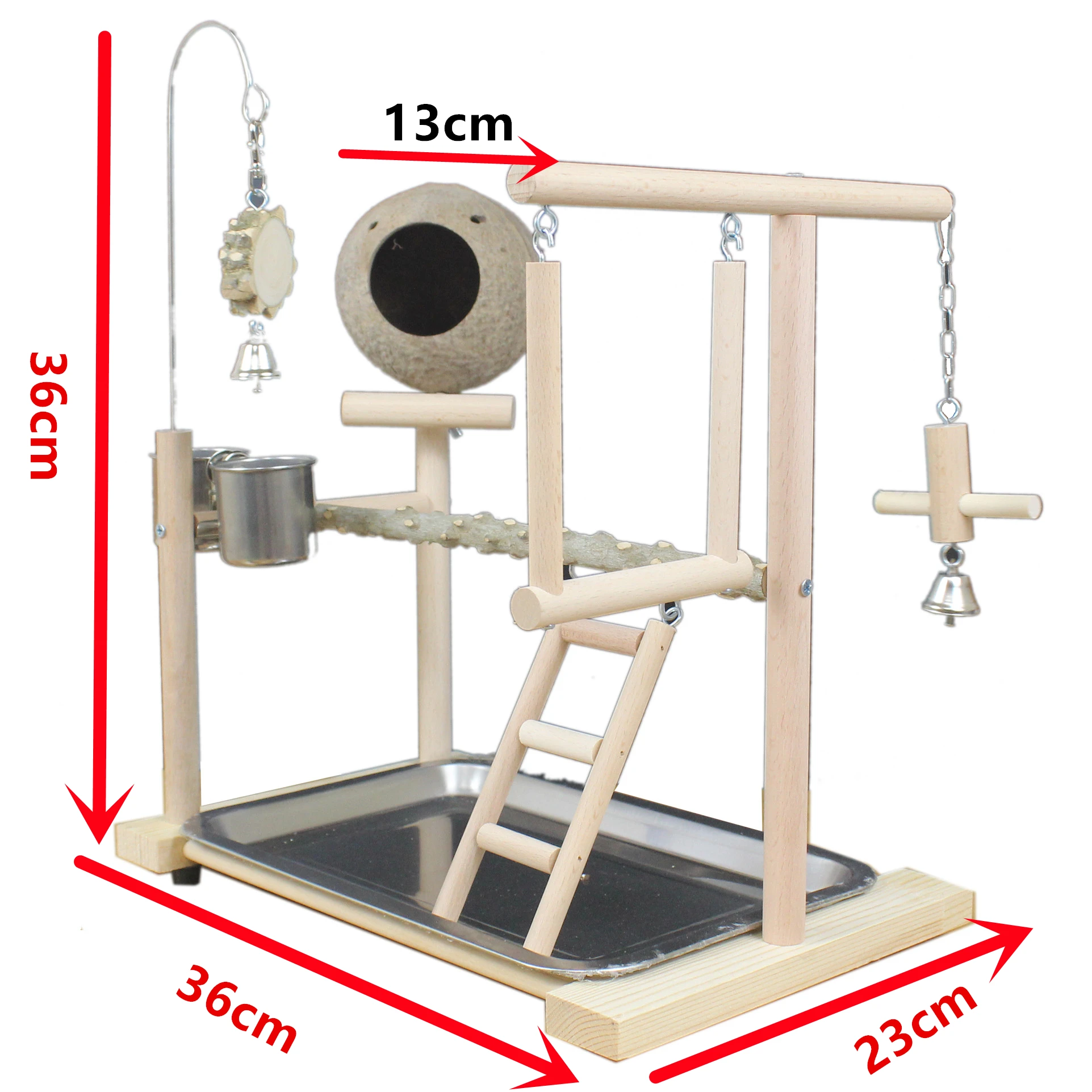 Parrot Playstand Kókuszdió -Héjjal, Szilárd Fa Papagáj Állvány Játék Mező Interaktív Képzési Keret Madárpolc Álló Bot