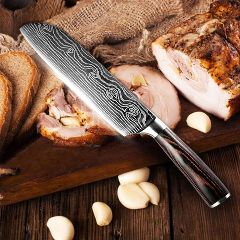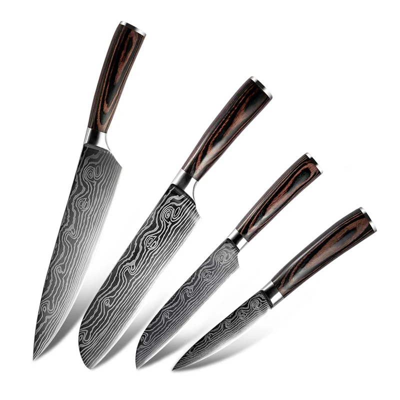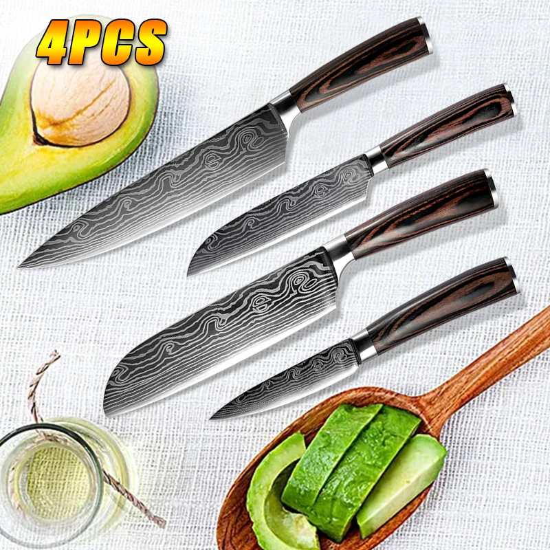 Professzionális 4 db Rozsdamentes Acél Konyhai Késkészlet Szakács Szeletelő Kenyér Santoku Segédprogram Paring Kés Kényelmes Fogantyú