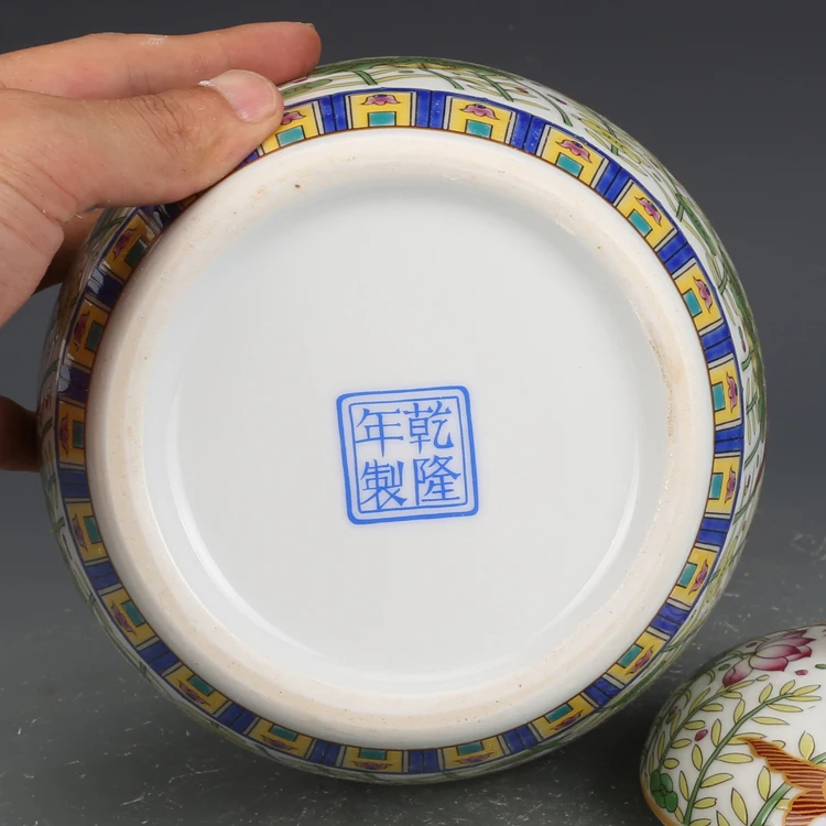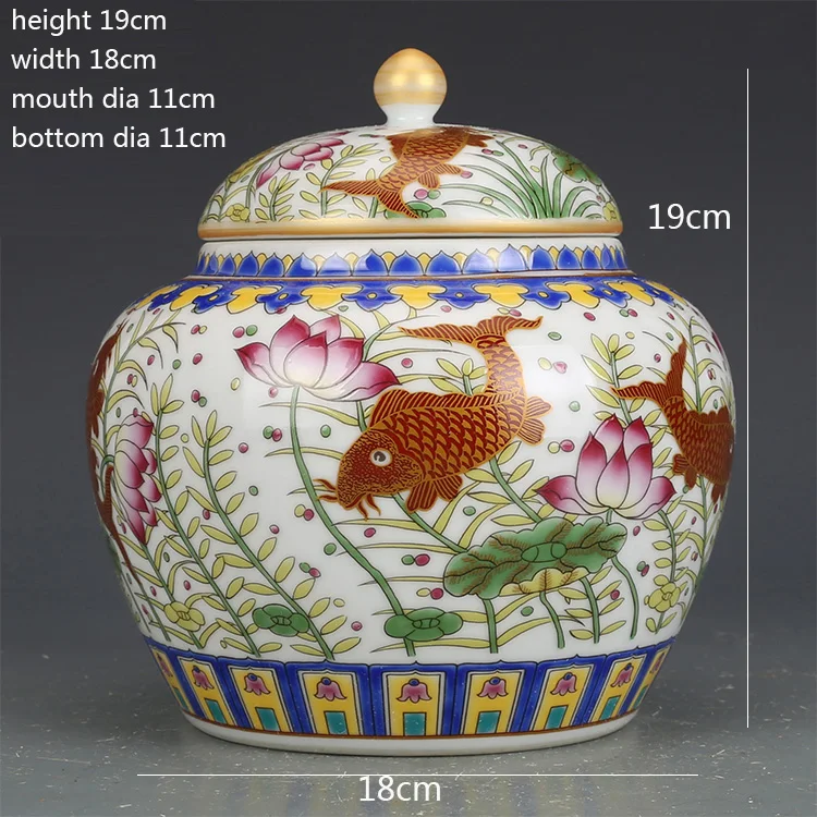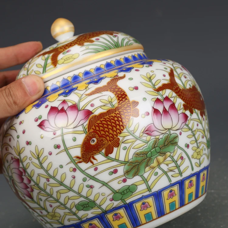 Qianlong Qing -Dinasztia Év Mark Zománc Hal Algák Can Tea Caddy Canist Antik Jar Kollekció