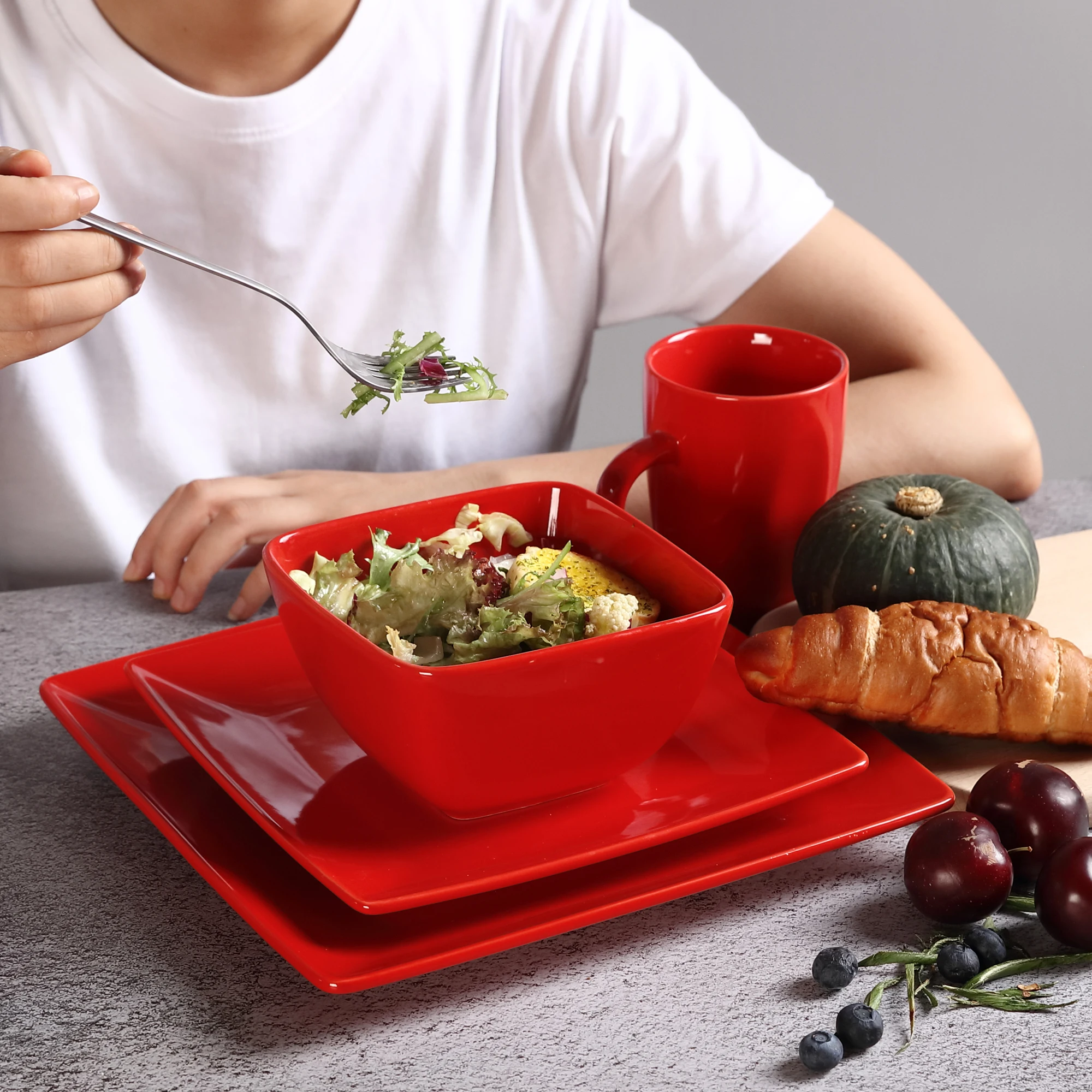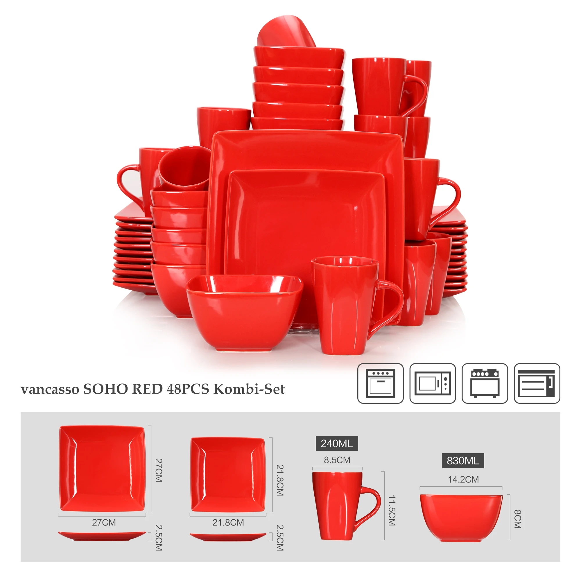 Vancasso Soho 16/32/48 Darabos Piros Kerámia Porcelán Négyzet Alakú Étkészlet Vacsora Tányérral, Desszert Tányér, Tál, 240 Ml Bögre Szett