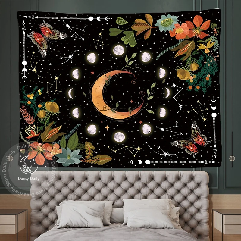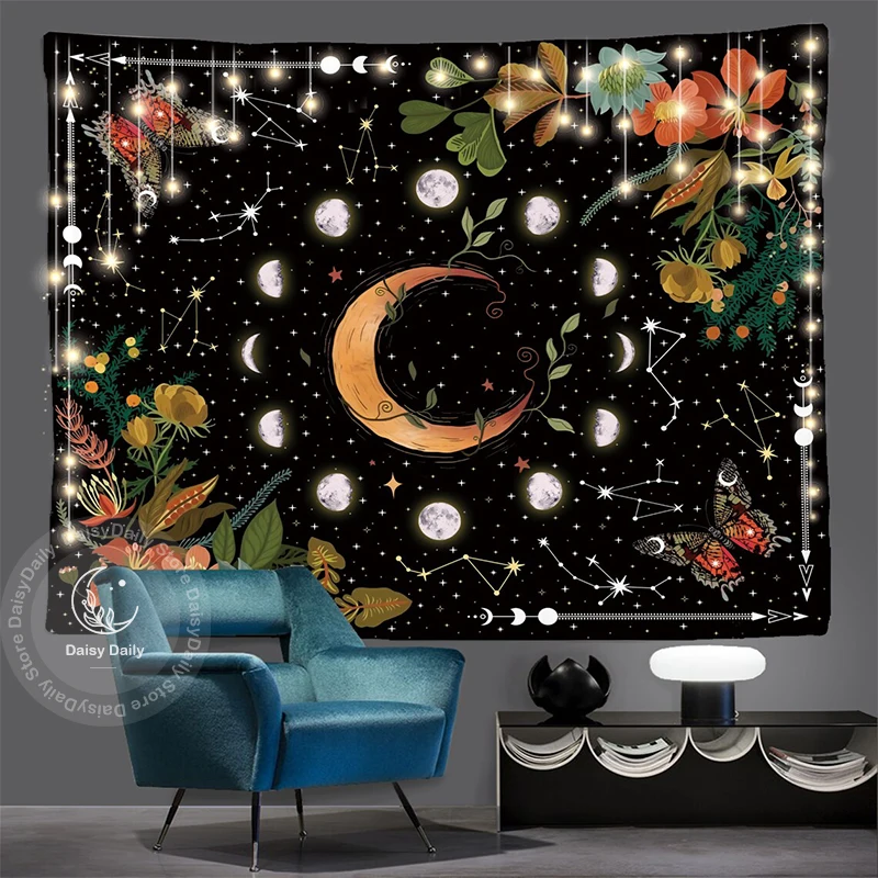 Virágos Kárpit Holdfázisú Botanikus Égi Csillagok Pillangó Éjszakai Kárpitok Fal Lógó Nappali Hálószoba Csillagszőnyeg