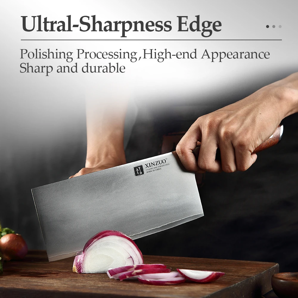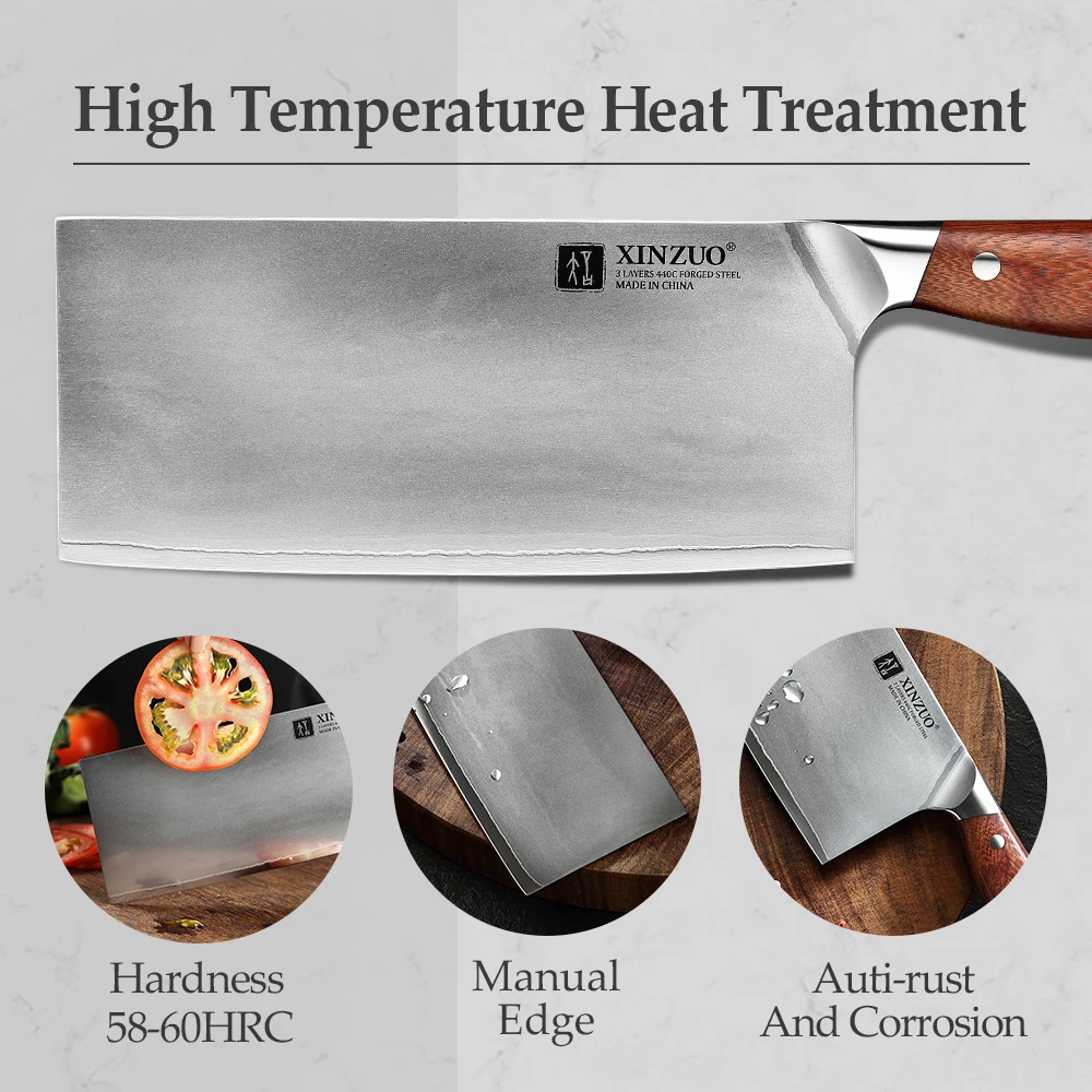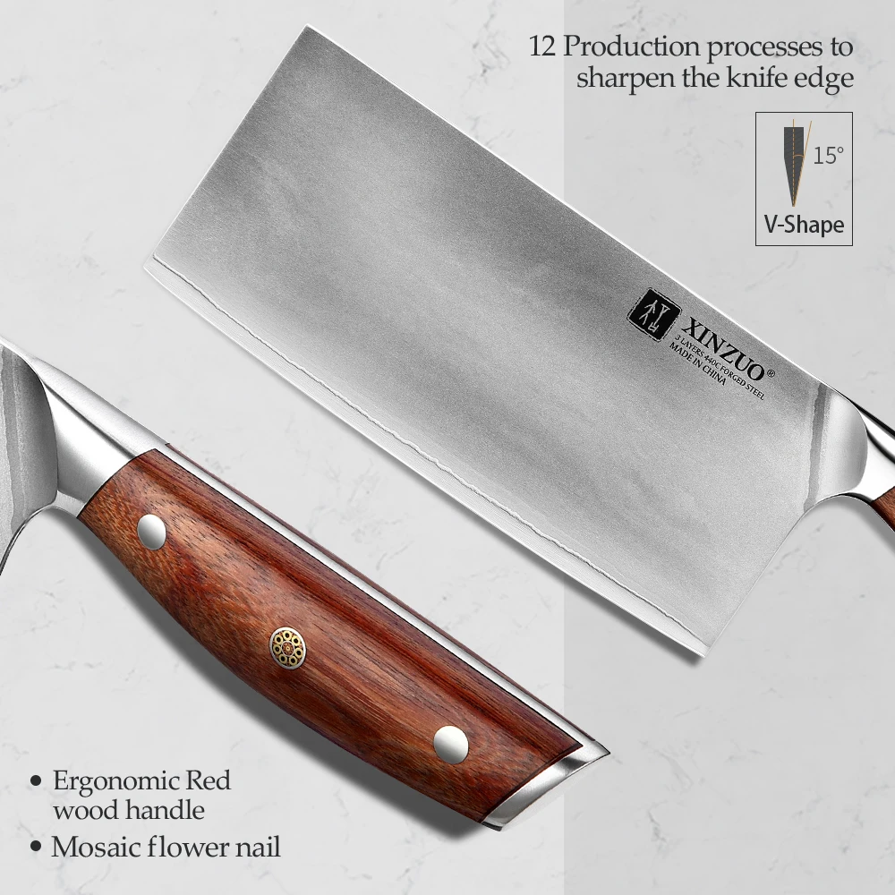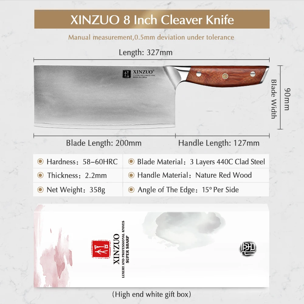 Xinzuo 8 ” Cleaver Knife 58-60 Hrc Rozsdamentes Acél Három Layres 440 ° C Burkolt Acél Szuper Éles Zöldségek Kés Vörös Fa Fogantyú