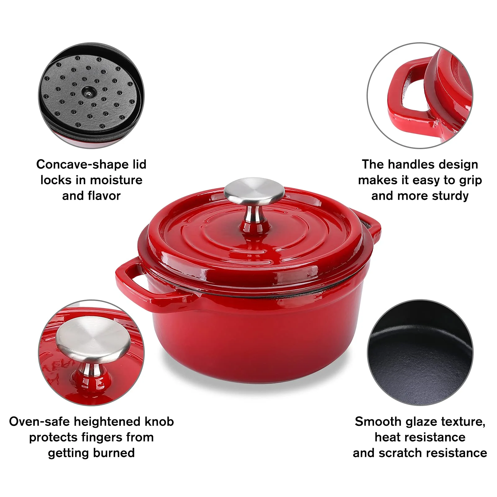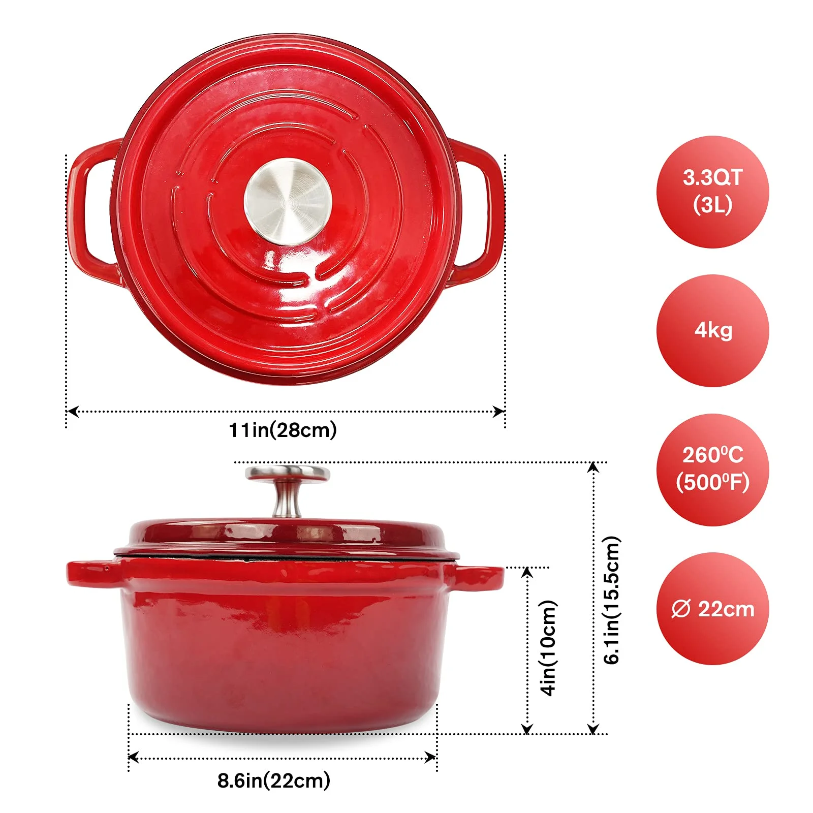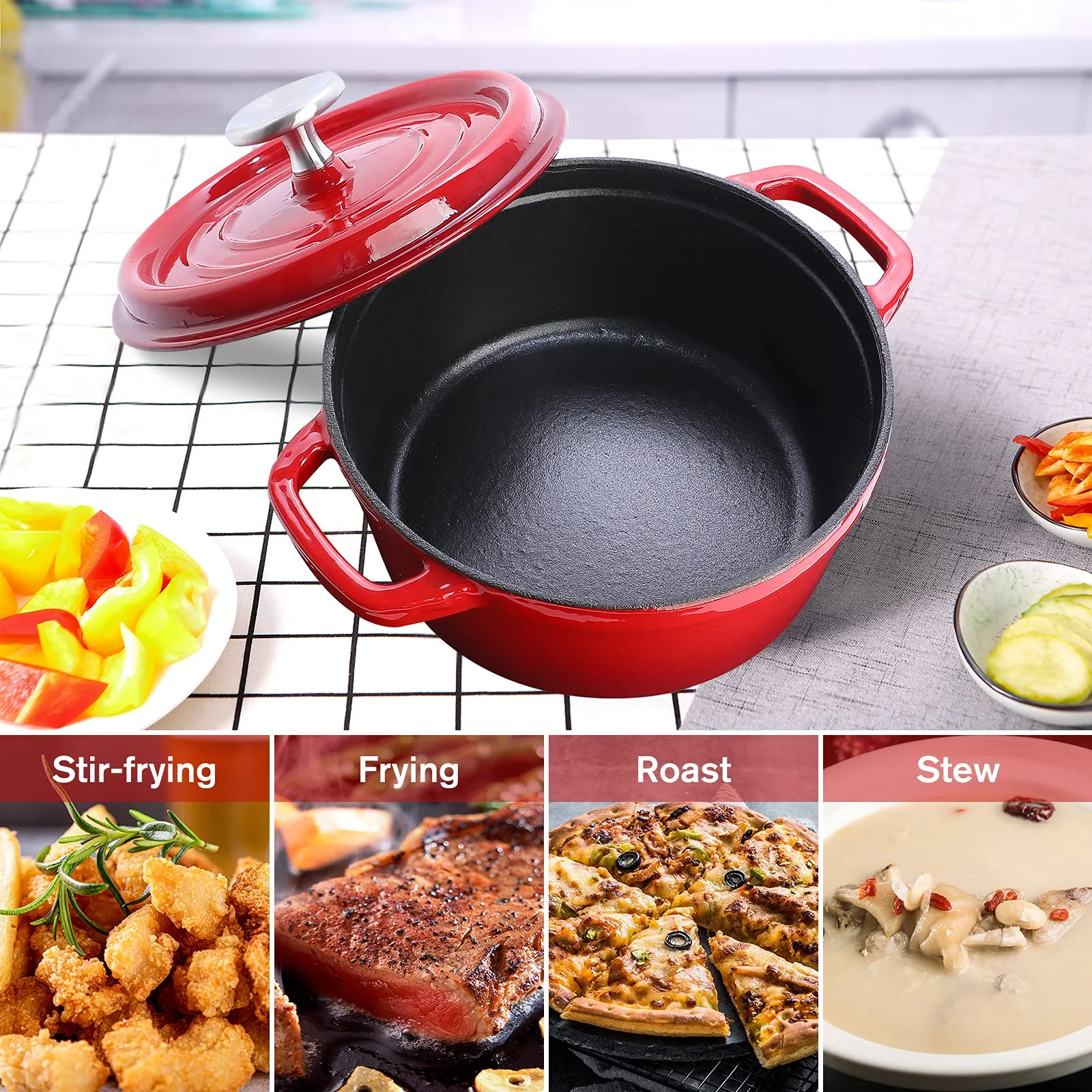 Zománcozott Öntöttvas Holland Sütő, 3,3 Quart Kerámia Edény Non-Rozsdás Zománccal Bevont Edények Serpenyője Fedéllel És Hurokfogantyúkkal Piros